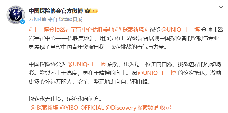 中国探险协会为王一博点赞,也为每一位走向自然、挑战边界的行动喝彩。